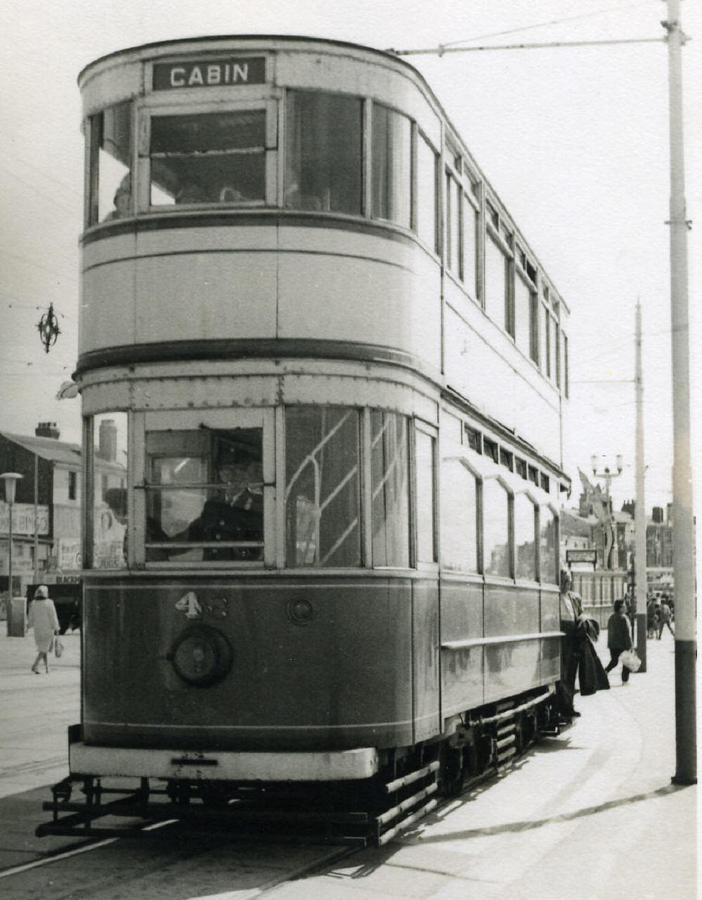 This is a double-decker tram that ran in Blackpool, England. Blackpool is a seaside resort town noted for its promenade and trams. It is the only city in England that has never stopped operating trams. Today, modern light-rail vehicles operate alongside the historic trams.