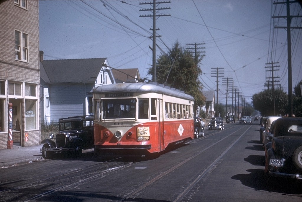 As built, car # 813 was used on the Portland city streetcar lines (3’6″ gauge). It was typically operated on the Broadway line and thus was nicknamed a “Broadway car.” It was one of 15 Brill Master Units operating in Portland. It was a very modern car designed for safety and one-man operation.